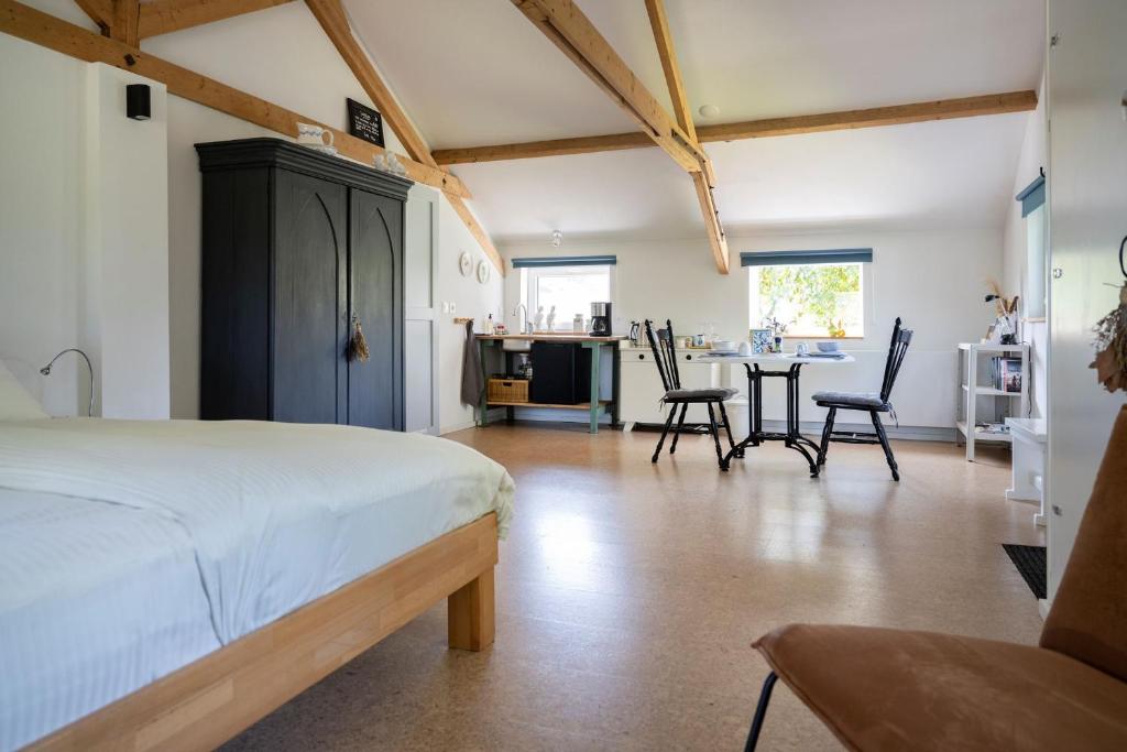 De B&B staat los van het woonhuis en heeft een eigen ingang en een afsluitbaar fietsenhok